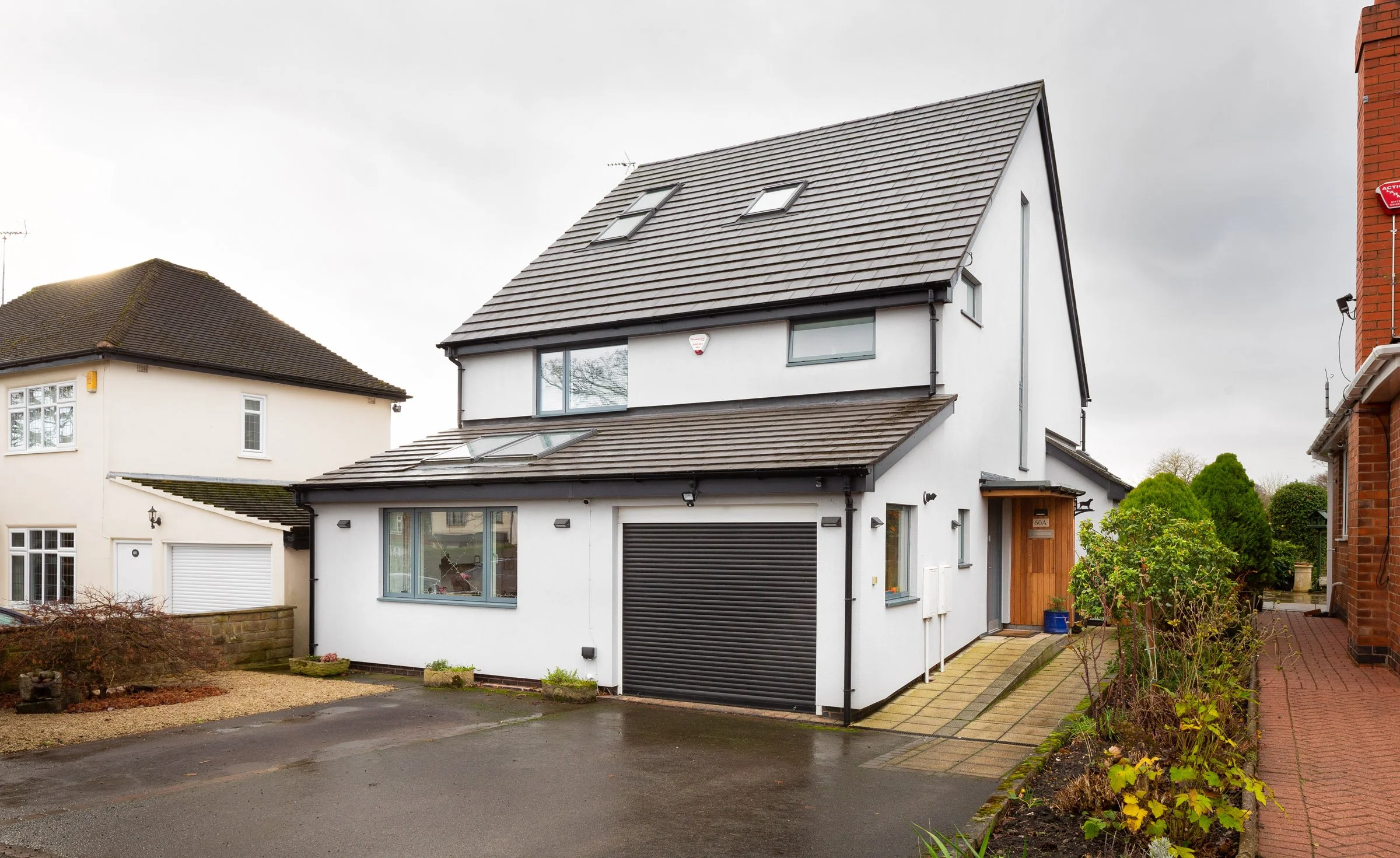 Energy efficiency was important in this project, and the shell of the existing house was wrapped in external wall insulation with a rendered finish. Triple-glazed composite timber and aluminium windows were installed together with a whole-house ventilation system. PV panels were installed within the roof at the rear and a battery was included in the plant room.